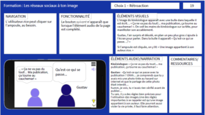 C’est ainsi que le scénarimage à produire au soutien de notre formation mobile s’adressait à l’équipe de développement et de production, et en ce sens, les consignes requises au scénarimage pouvaient varier. Nous avons donc essayé d’être le plus précises possibles.